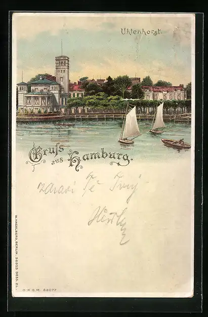 Lithographie Hamburg, Uhlenhorst, Fährhaus, Segelboote, Halt gegen das Licht