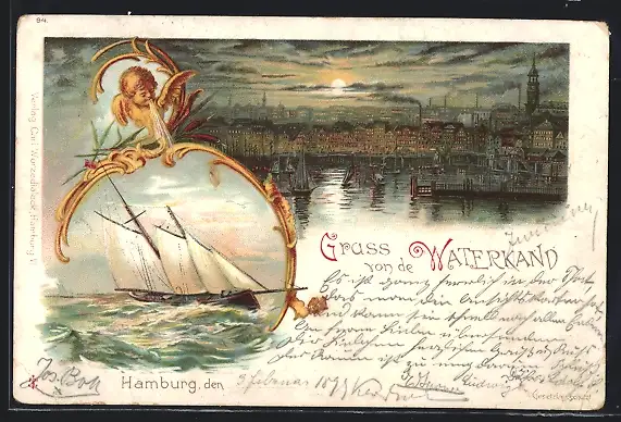 Lithographie Hamburg, Windengel und Segelschiff, Teilansicht bei Vollmond