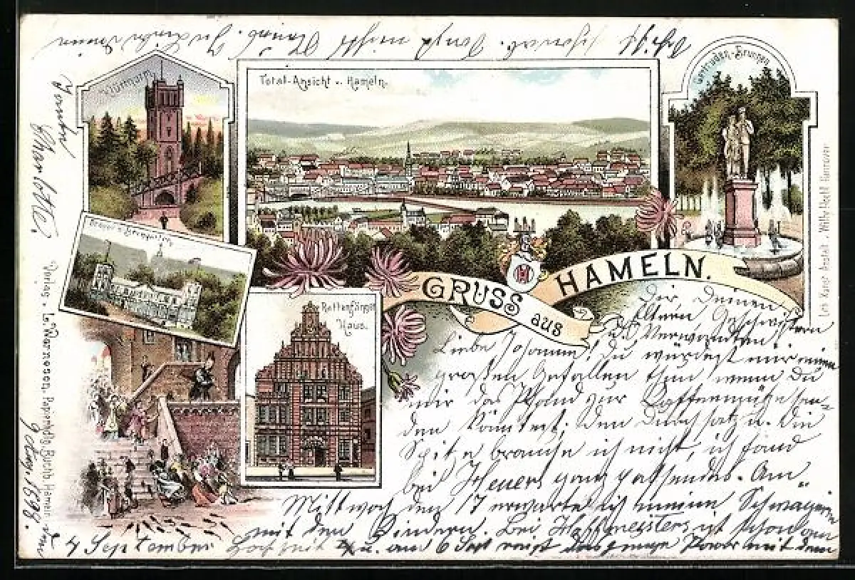 Lithographie Hameln, Totalansicht, Gertrudenbrunnen, Dreyers Berggarten & Klütthurm