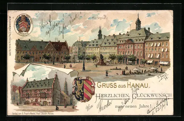 Lithographie Hanau, Marktplatz, Altstädter Rathaus, Wappen