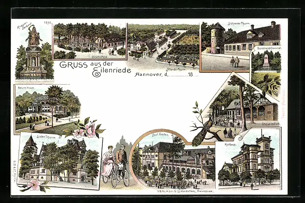 Lithographie Hannover, Eilenriede, Gasthaus Bischofshol, Döhrener Turm, Steuerndieb, Kurhaus, Zoologischer Garten