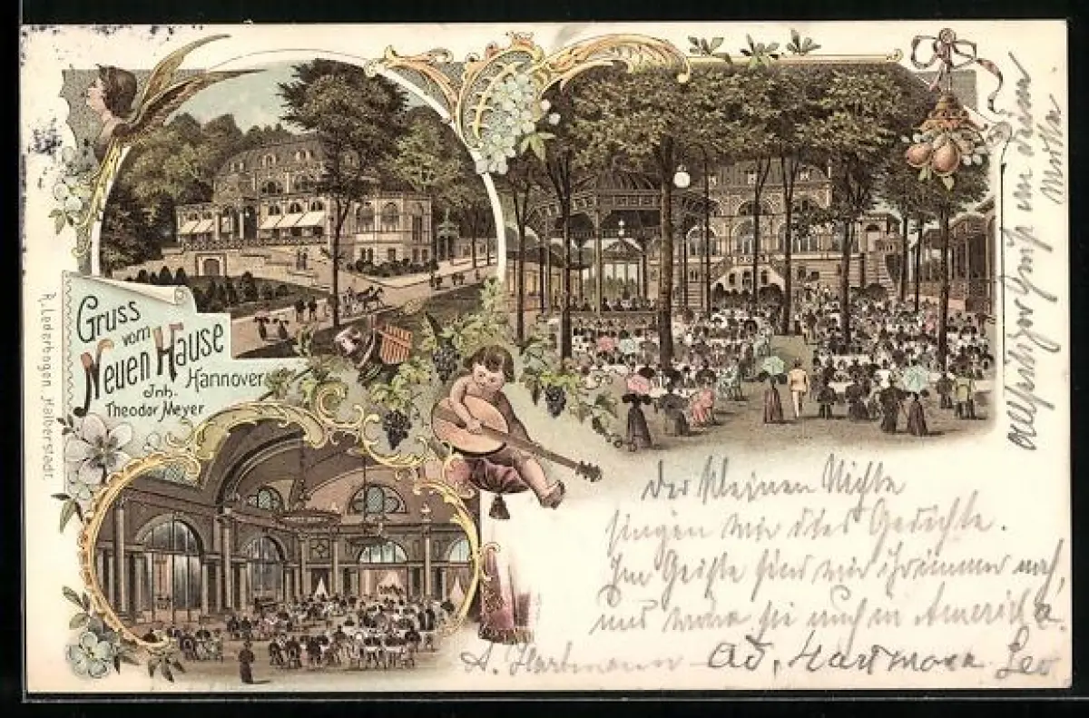 Lithographie Hannover, Gaststätte Neues Haus, Inh. Theodor Meyer, Innen- und Aussenansichten