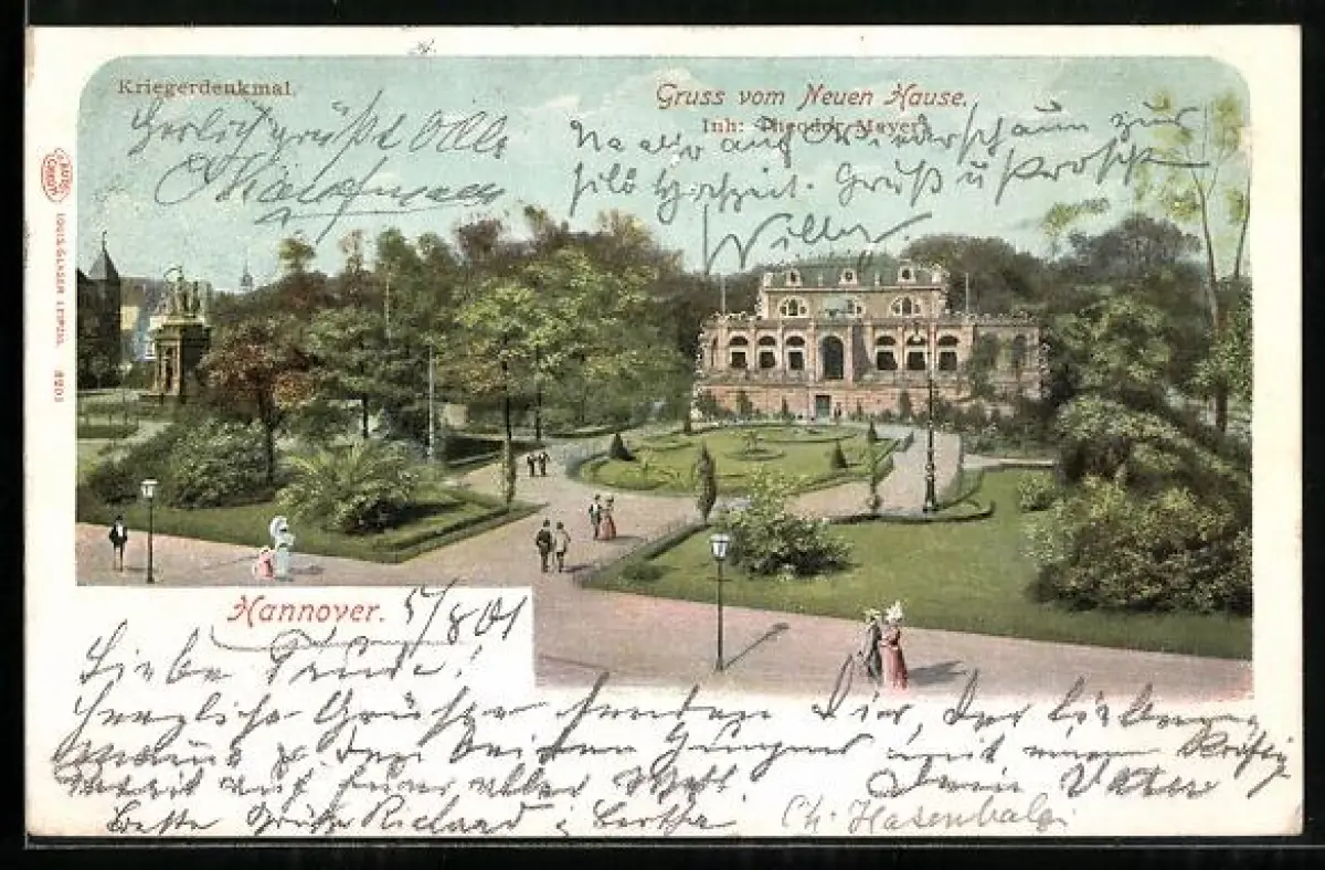 Lithographie Hannover, Kriegerdenkmal, Neues Haus, Inh. Direktor Meyer
