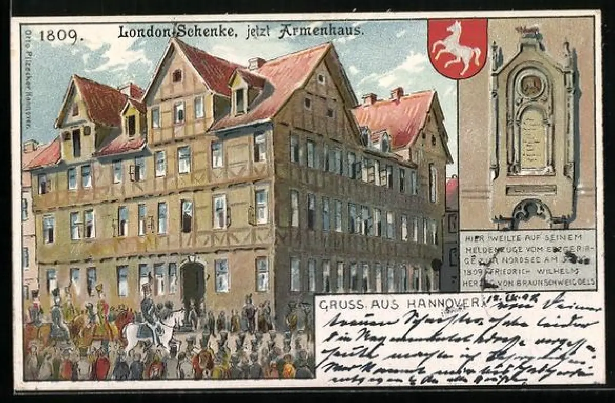 Lithographie Hannover, London-Schenke 1809, jetzt Armenhaus