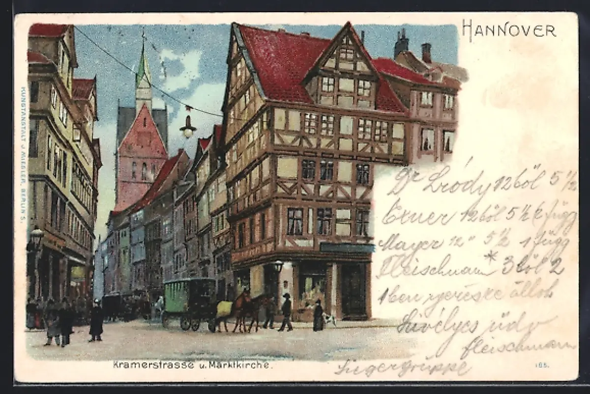 Lithographie Hannover, Partie an der Kramerstrasse mit Marktkirche