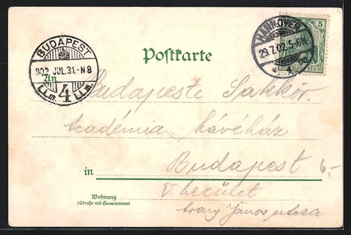 gelaufen 1902, Bugspur rechts oben, Eckknick rechts oben, sonst guter Zustand
