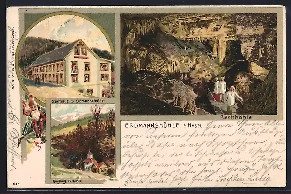 Lithographie Hasel, Gasthaus zur Erdmannshöhle, Bachhöhle, Eingang zur Höhle