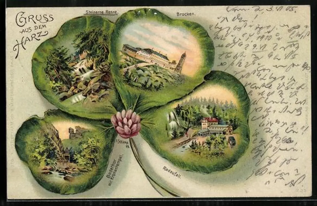 Lithographie Hasserode, Teilansichten vom Ort in einem Kleeblatt