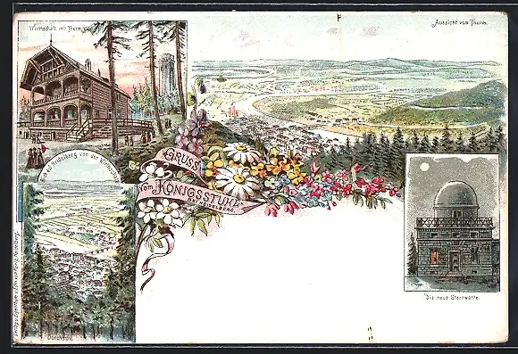 Lithographie Heidelberg /Neckar, Gasthof Königsstuhl mit Turm, Blick auf den Ort, Neue Sternwarte bei Mondschein