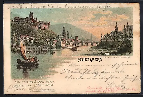Lithographie Heidelberg / Neckar, Leute in Booten aus Wasser, Brücke, mit Spruch