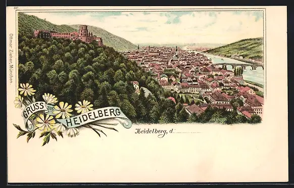Lithographie Heidelberg, Totalansicht aus der Vogelschau