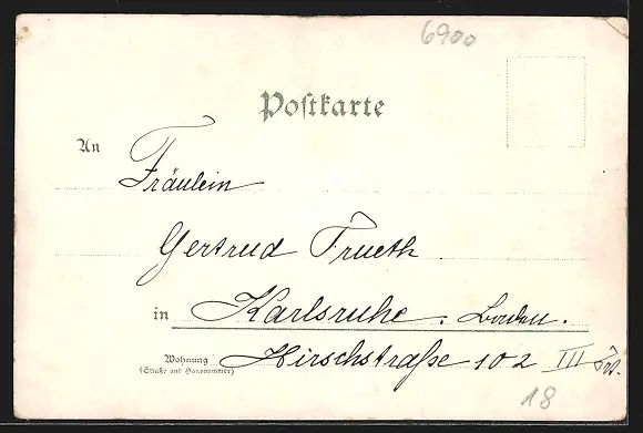 Personenbezogene Daten auf der Rückseite der Karte wurden durch blauen Textmarker unkenntlich gemacht. Die blauen Stellen sind auf die Vorderseite durchgeweicht und wirken sich negativ auf das Postkartenfoto aus