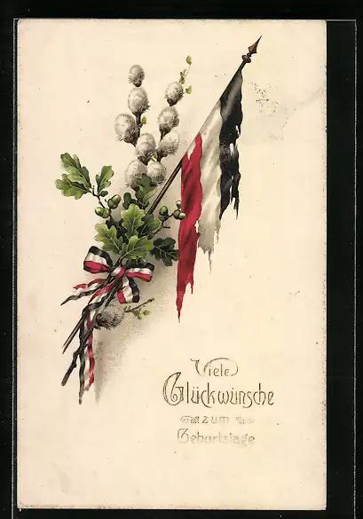 Lithographie Heil Dir mein Vaterland - Weidenkätzchen, Eichenlaub, Zerfetzte Fahne