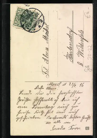 Personenbezogene Daten auf der Rückseite der Karte wurden durch blauen Textmarker unkenntlich gemacht. Die blauen Stellen sind auf die Vorderseite durchgeweicht und wirken sich negativ auf das Postkartenfoto aus