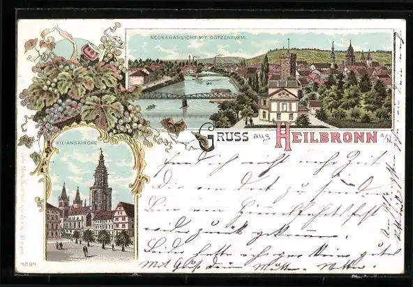 Lithographie Heilbronn, Neckaransicht mit Götzenturm, Kilianskirche