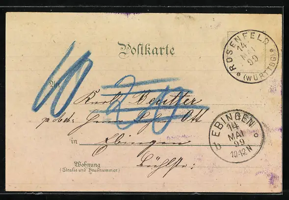 Personenbezogene Daten auf der Rückseite der Karte wurden durch blauen Textmarker unkenntlich gemacht. Die blauen Stellen sind auf die Vorderseite durchgeweicht und wirken sich negativ auf das Postkartenfoto aus
