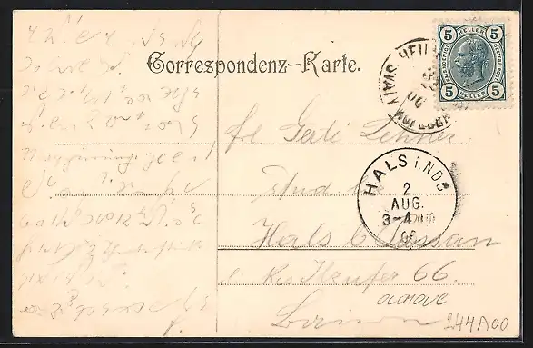 Personenbezogene Daten auf der Rückseite der Karte wurden durch blauen Textmarker unkenntlich gemacht. Die blauen Stellen sind auf die Vorderseite durchgeweicht und wirken sich negativ auf das Postkartenfoto aus