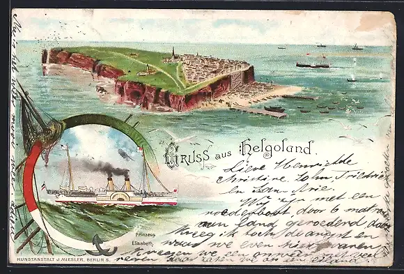 Lithographie Helgoland, Dampfer Prinzess Elisabeth mit Insel-Panorama