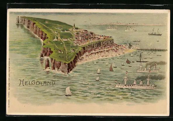 Lithographie Helgoland, Gesamtansicht aus der Vogelschau mit Schiffen