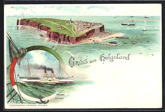 Lithographie Helgoland, Gesamtansicht mit Salondampfer Cobra