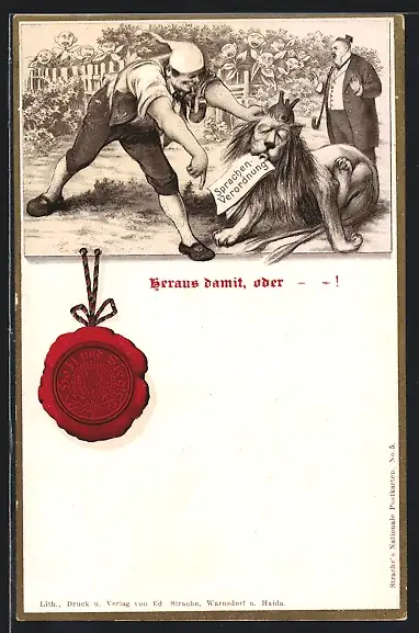 Lithographie Heraus damit, oder...!, Deutscher Michel und Löwe mit Sprachverordnung im Maul