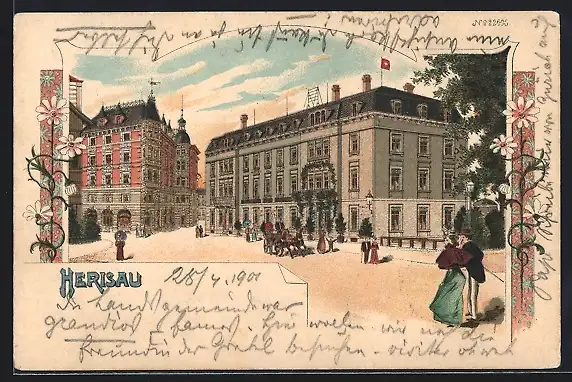 Lithographie Herisau, Partie am Markt mit Geschäften