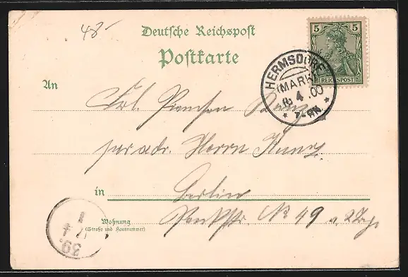 gelaufen 1900, Eckknicke li. unten u. re., Ecken bestoßen, guter Zustand