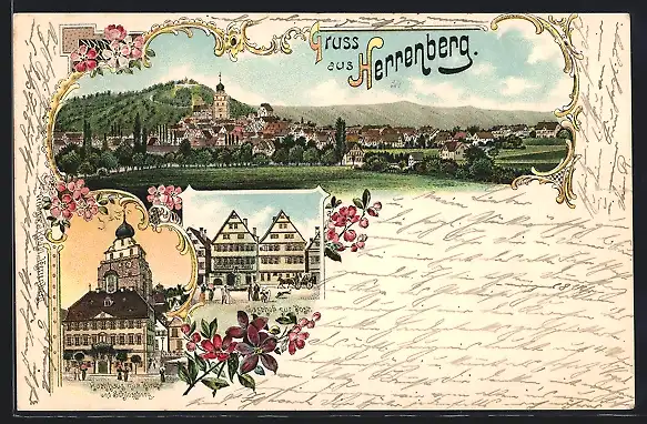 Lithographie Herrenberg, Gasthof zur Post, Rathaus mit Kirche