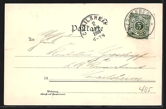 Personenbezogene Daten auf der Rückseite der Karte wurden durch blauen Textmarker unkenntlich gemacht. Die blauen Stellen sind auf die Vorderseite durchgeweicht und wirken sich negativ auf das Postkartenfoto aus