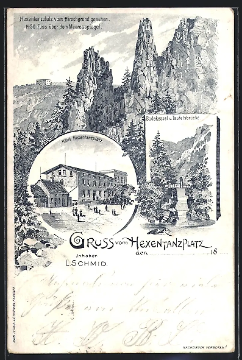 Lithographie Hexentanzplatz, Bodekessel und Teufelsbrücke, Partie am Hirschgrund