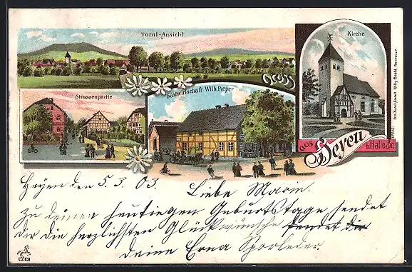 Lithographie Heyen / Br., Gasthaus Wilh. Pieper, Kirche, Strassenpartie