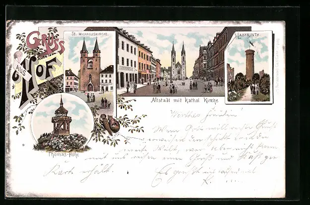 Lithographie Hof, St. Michaelskirche, Thomas-Höhe, Altstadt mit kath. Kirche, Labyrinth