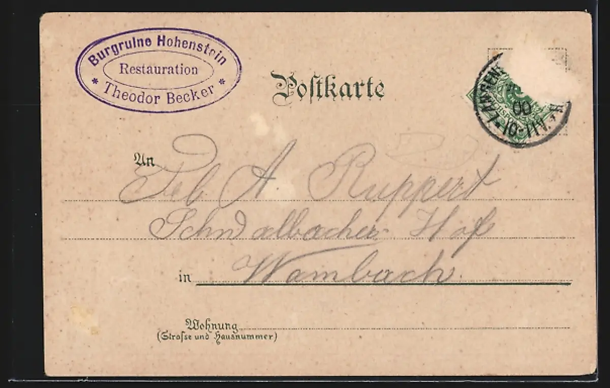 Lithographie Hohenstein / Aartal, Panorama mit Burg Hohenstein, Gasthof z. Burg Hohenstein a. Bahnhof