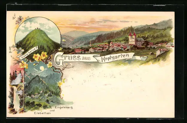 Lithographie Hopfgarten, Totalansicht, Hohe Salve, Engelsberg und Elsbethen
