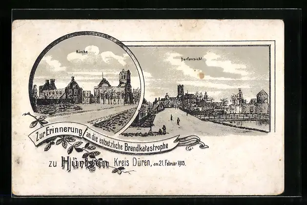 Lithographie Hürtgen b. Düren, Dorfansicht, Kirche, Zur Erinnerung an die Brandkatastrophe