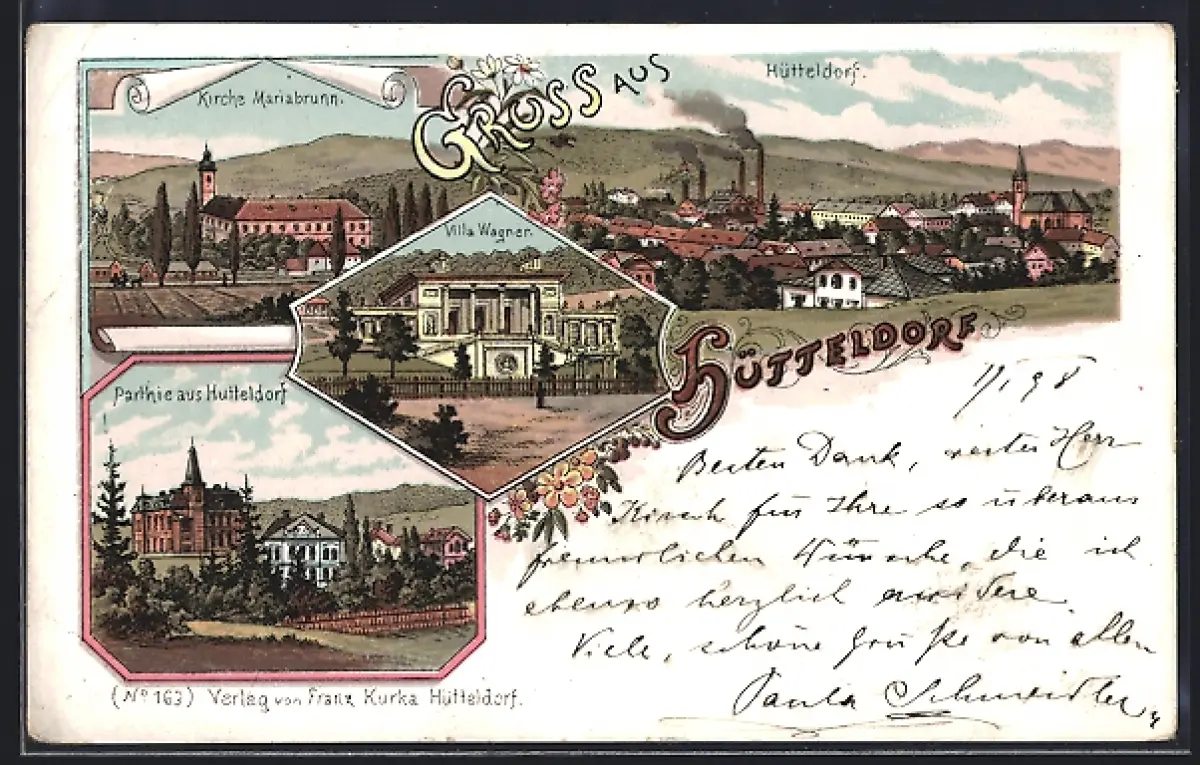Lithographie Hütteldorf, Villa Wagner, Kirche Mariabrunn, Ortsansicht