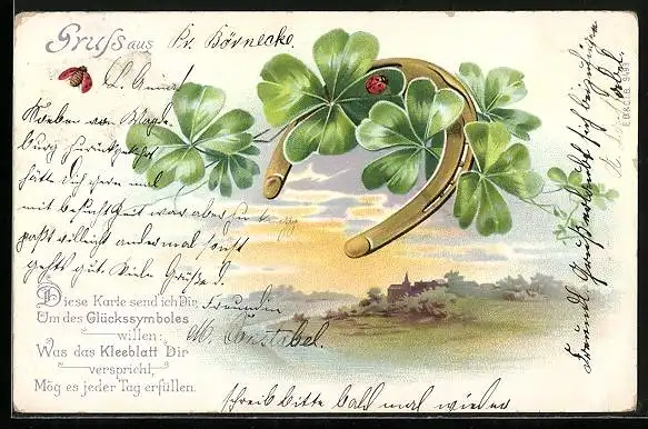 Lithographie Hufeisen mit Kleeblättern und Mariechenkäfern