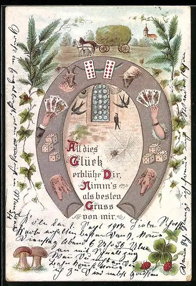 Lithographie Hufeisen mit Spielkarten, Schweinen, Würfeln und Kleeblatt