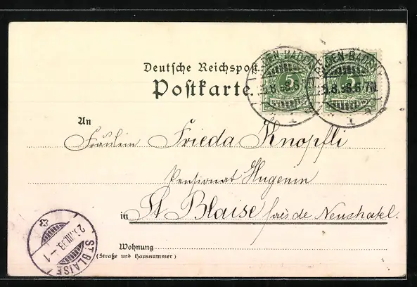 Personenbezogene Daten auf der Rückseite der Karte wurden durch blauen Textmarker unkenntlich gemacht. Die blauen Stellen sind auf die Vorderseite durchgeweicht und wirken sich negativ auf das Postkartenfoto aus