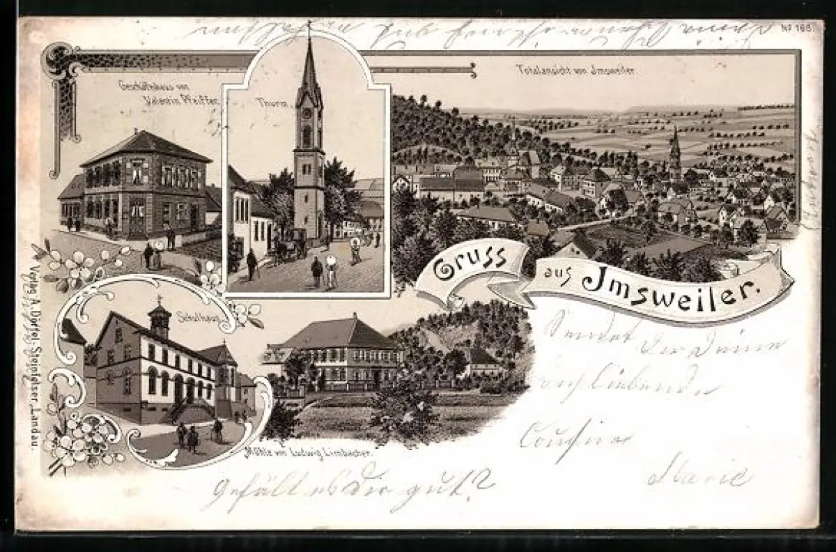 Lithographie Imsweiler, Mühle von Ludwig Limbacher, Geschäftshaus von Valentin Pfeiffer, Turm, Schulhaus, Totalansicht