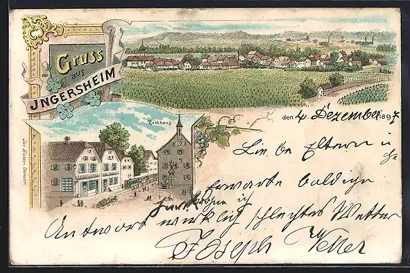 Lithographie Ingersheim, Rathhaus und Totalansicht