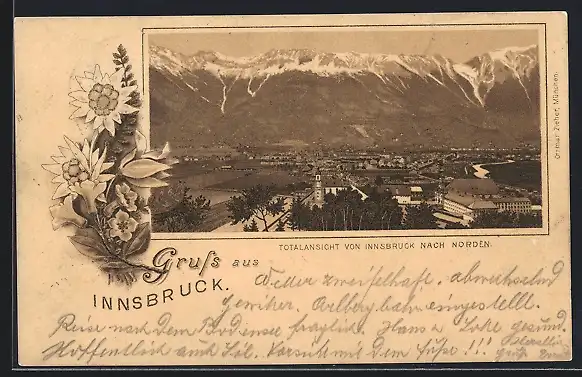 Lithographie Innsbruck, Totalansicht nach Norden, Edelweiss und Enzian
