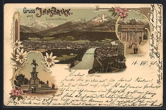 Lithographie Innsbruck, Triumphpforte, Leopoldsbrunnen und Stadtpanorama