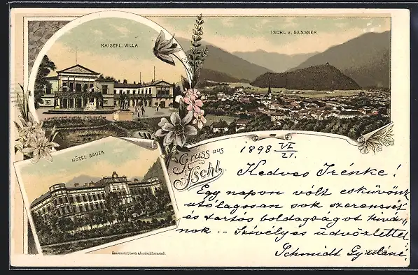 Lithographie Ischl, Hotel Bauer, Kaiserliche Villa, Totalansicht