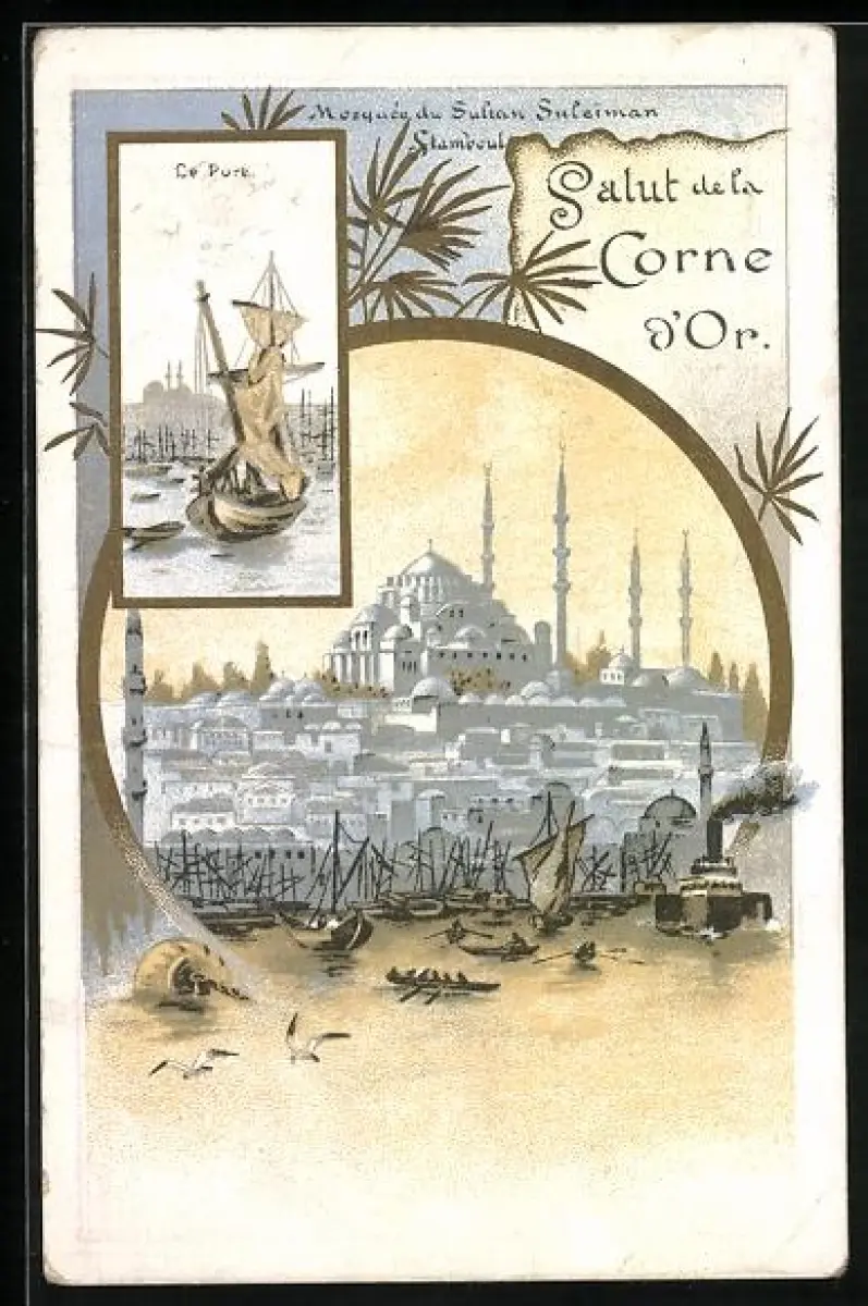 Lithographie Istanbul, Corne d`Or, Le Port, Mosquée du Sultan Suleiman