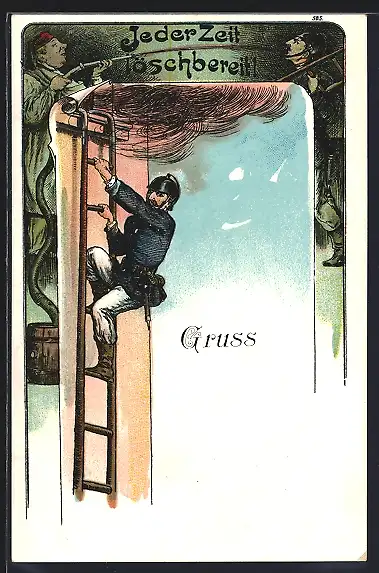 Lithographie Jeder Zeit löschbereit!, Feuerwehrmann erklimmt Leiter