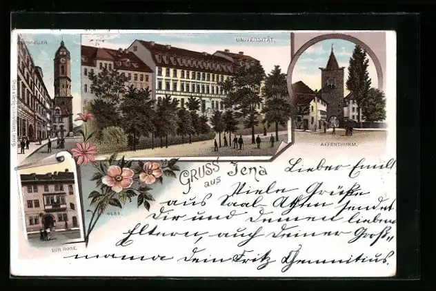 Lithographie Jena, Burgkeller, Zur Rose, Universität, Affenturm