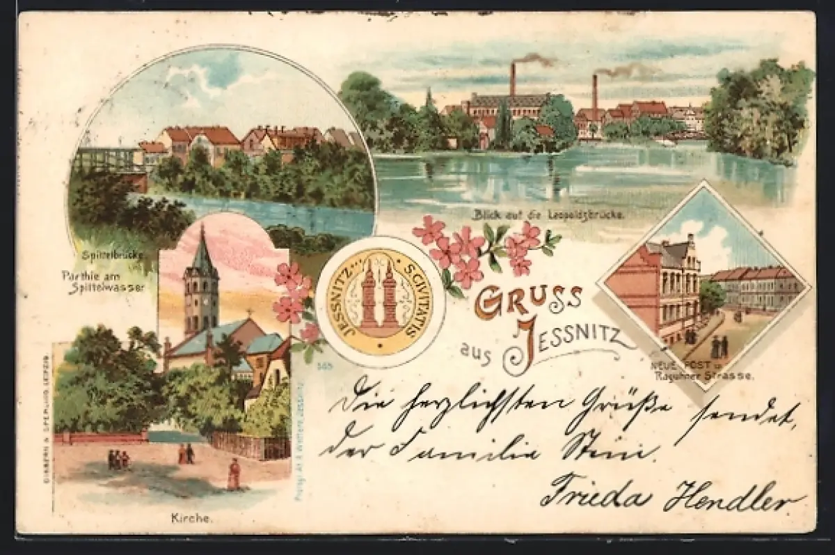 Lithographie Jessnitz, Neue Post und Raguhner Strasse, Kirche, Blick auf die Leopoldsbrücke