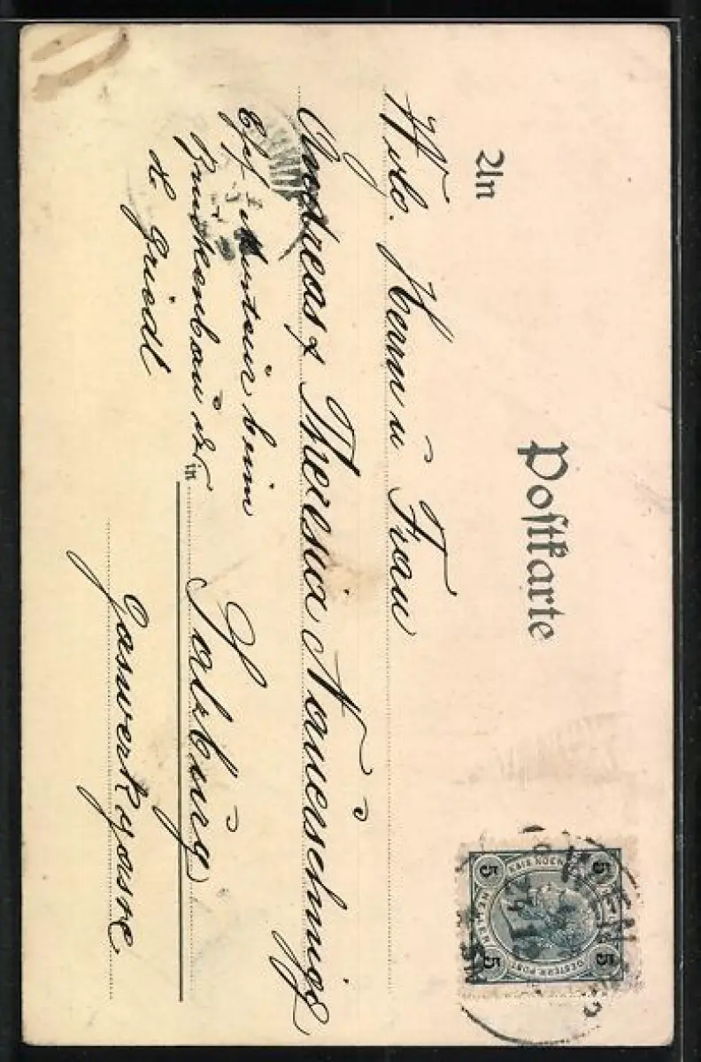 Personenbezogene Daten auf der Rückseite der Karte wurden durch blauen Textmarker unkenntlich gemacht. Die blauen Stellen sind auf die Vorderseite durchgeweicht und wirken sich negativ auf das Postkartenfoto aus