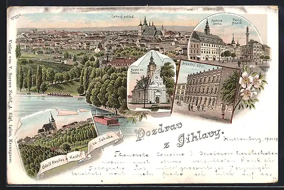 Lithographie Jihlavy, Calkový pohled, Besední dum, Kostel sv. Ducha, Údolí Heulos a Kostel sv Jakuba, Radnice Socha